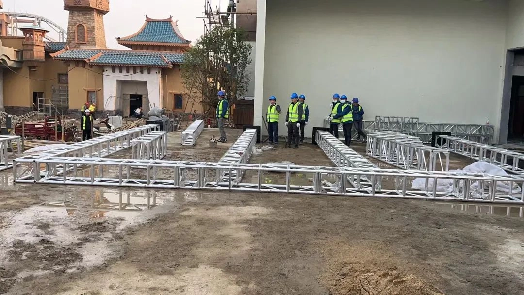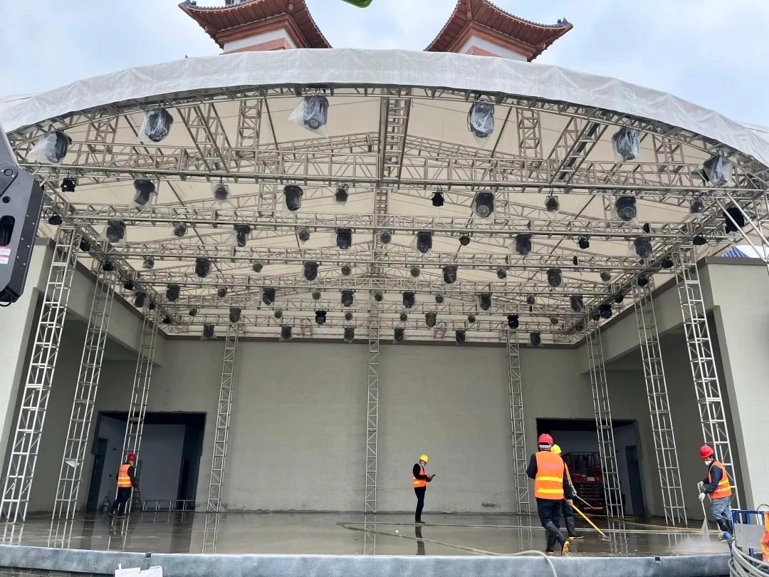 Shinestage provides the project with the gold lettered roof structure composed of 400*400 and other specifications aluminum plate screwed four-sided straight frame, with tight seams, high precision and strong load-bearing, which is suitable for various application scenes such as cultural and tourism venues, professional performances, theaters and theaters, and exhibition industries.