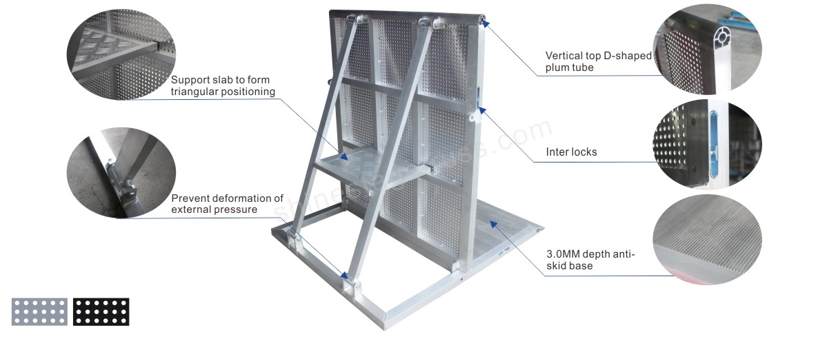 utdoor Crowd Control Barriers (full name:portable folding Stage Barrier) refers to a light and fastbarrier device, which is a kind of security for the crowd-intensive, pioneering andriot-type places to form a fast and multi-piece connection to form an isolated seat belt. Physical protection barrier. The concert crowd control barriers is wildly used to prevent the disturbance of human flow on the occasions where there are many people dangerous.Keep the audience away from the performance.Keep the audience at a safe and appropriate distance from the stage.large international conference security.Large sports, sports security, security isolation.