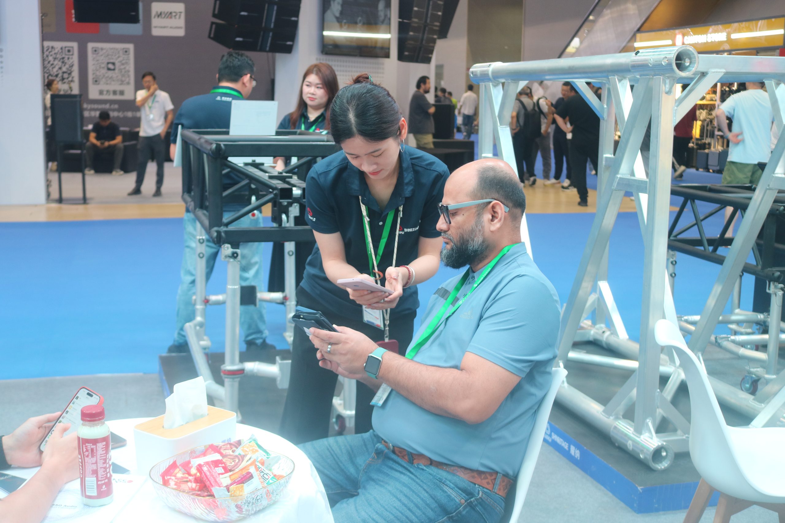 Shinestage’s experienced technical team was present throughout the event to provide detailed product demonstrations, technical principle breakdowns, and application solution clarifications. From the extreme load-bearing principles of truss structures, and creative implementation of modular designs, to the efficiency synergy of stage platforms and tool carts, and the safety deployment logic of anti-riot barriers, deep technical exchanges sparked constructive discussions. Meanwhile, the business team efficiently connected with numerous potential partners and clients, discussing specific project needs, custom solutions, and future cooperation possibilities, creating a lively and productive atmosphere.