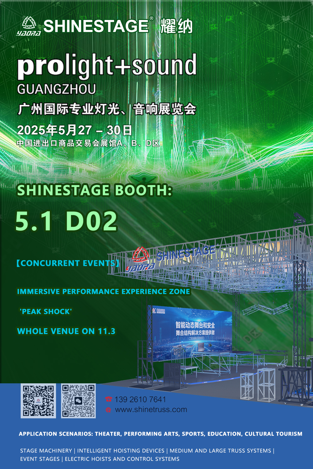 From May 27 to 30, 2025, visit Booth D02, Hall 5.1 at the China Import and Export Fair Complex to witness Shinestage’s groundbreaking innovations firsthand. Don’t miss the “PEAK SHOCK” Immersive Experience Zone in Hall 11.3, where the limitless potential of stage technology comes to life.